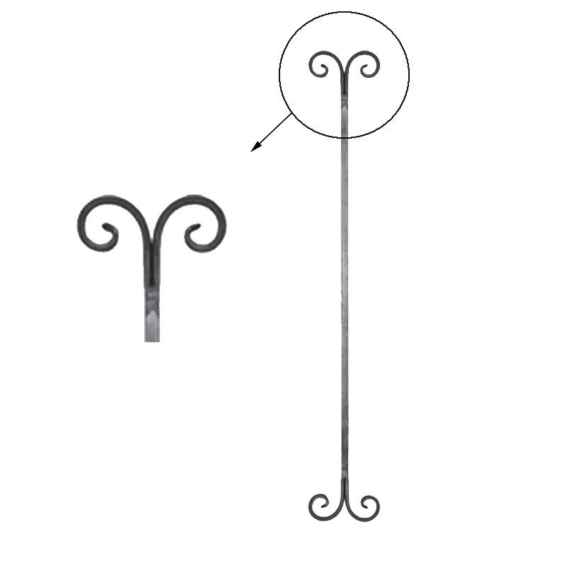 Balustre droit forgé à chaud en carré de 14x14mm, hauteur 900mm . Les extrémités sont évasées recourbées avec extrémités enroulées amincies d'oie largeur 130mm. Plutôt destiné aux gardes corps horizontaux.