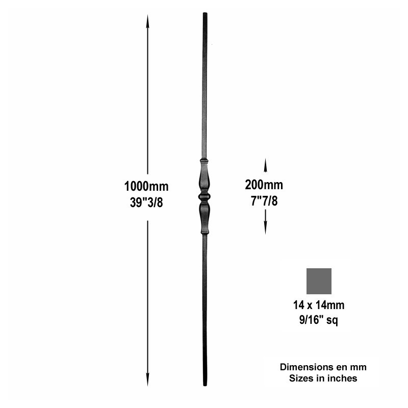 Balustre droit forgé à chaud en carré de 14x14mm, hauteur 1100mm grenaillé. Motif central forgé hauteur 200mm.Le grenaillage permet d'enlever l'ensemble de la calamine résultant de sa fabrication forgée ce qui donne au balustre un aspect fini de très belle qualité.