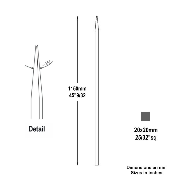Barreau appointé carré de 20x20mm longueur 1150 mm (1,150 mètre), forgé 4 faces. Les extrémités ne sont pas entièrement pointues (sécurité) l'angle de forgeage est de 15° environ.