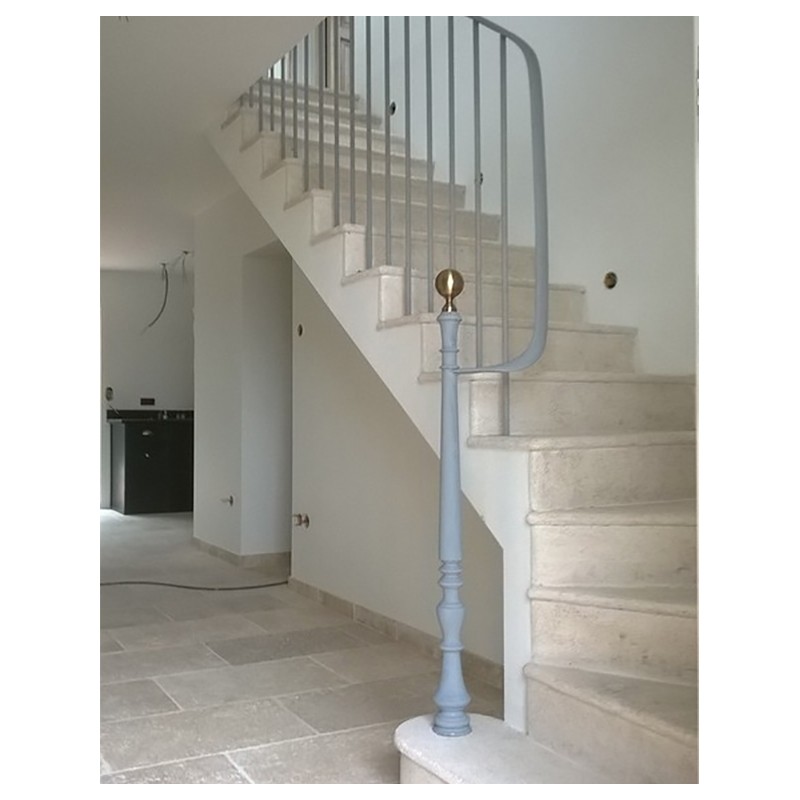 Poteau en forme de quille en fonte avec une embase Ø95mm. Hauteur 1150mm. Ce poteau est équipé d'un insert M10 pour fixation d'une boule de départ d'escalier.